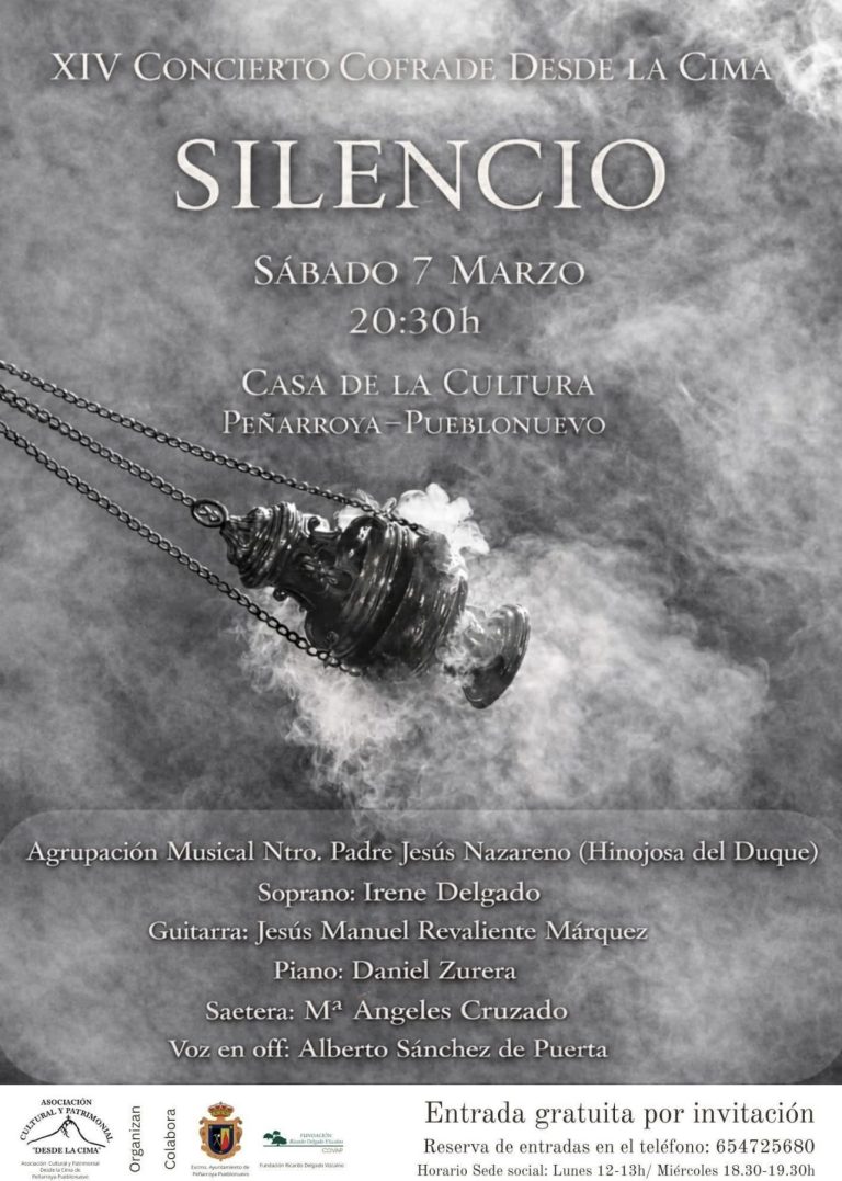 La Casa de la Cultura de Peñarroya-Pueblonuevo acogerá el próximo sábado 7 de marzo, a partir de las 20:30 horas, la celebración del XIV Concierto Cofrade «Desde la Cima: Silencio», una cita ya consolidada dentro de la programación cultural y cofrade del municipio.